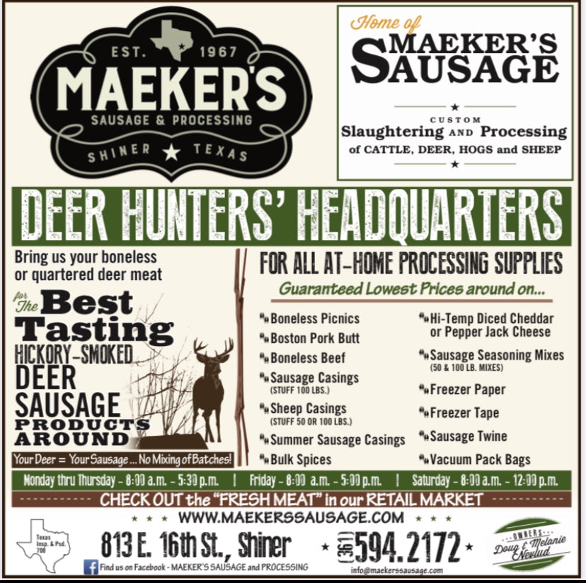 Maeker's Sausage and Processing is a family owned and operated processing plant and meat market located in Shiner, TX – the "Cleanest Little City in Texas." We are a state inspected facility that currently offers a variety of quality hickory-smoked sausage products that are hand crafted in small batches. We offer fresh meats in our retail market, and we also provide custom slaughtering and processing of cattle, hogs, sheep and deer. Maeker's sausage is available in numerous grocery stores, including HEBs, Brookshire Brothers, Wal-Marts, and Lowe's Markets in the south-central Texas region as well as a variety of BBQ restaurants. Taste our sausage at these locations or come by our storefront in Shiner to get some Real Texas Sausage!